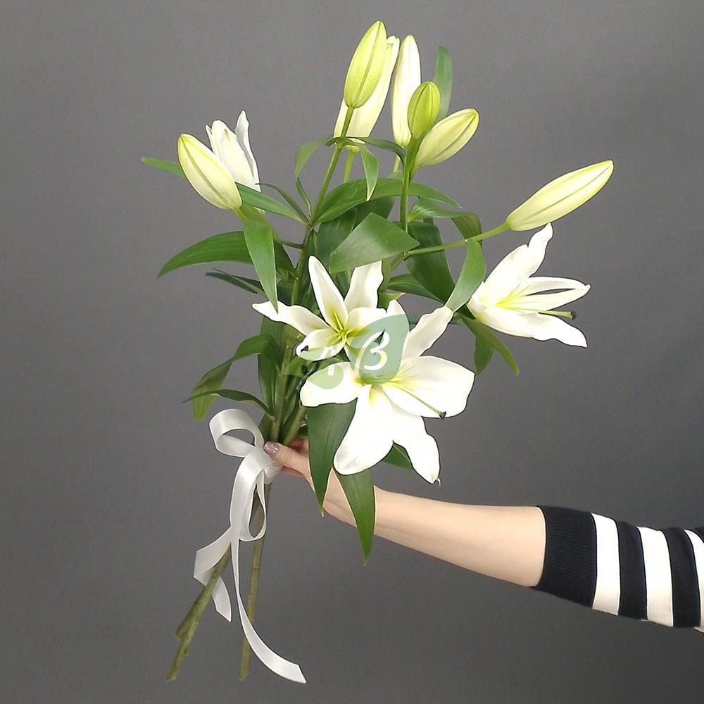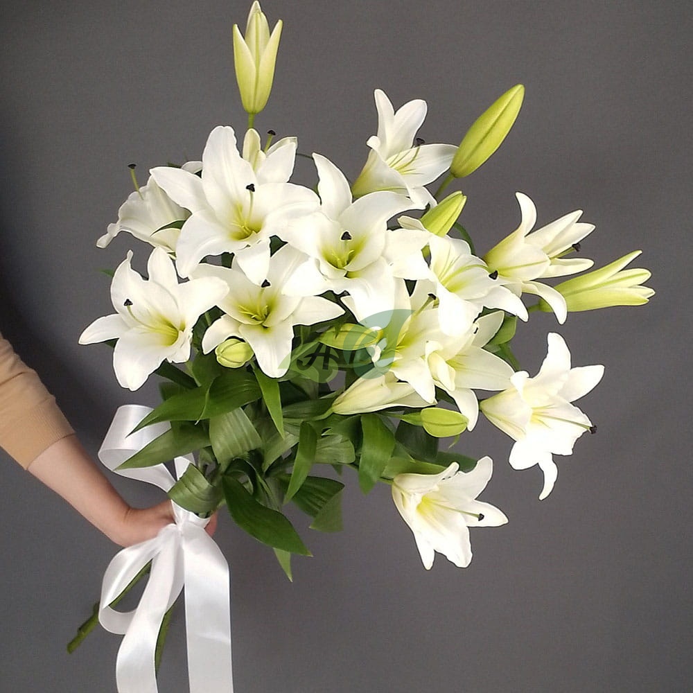 Наши флористы не используют дополнительных украшений для лилий. Ведь букет из этих величественных цветов красив и без лишней мишуры.